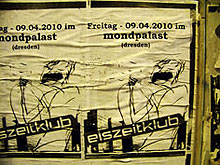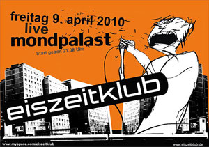 | 18.04.09 | EISZEITKLUB on the road Jetzt ist es fest: am 1.5. spielen wir im Dresdner Beatpol (ex-Starclub) als Support für Super 700. Am 24.4. sind wir bereits unterwegs auf unserer KlubTour. Start ist in Magdeburg im Studentclub Baracke - mit den Bands des PopKulTour-Festivals. Alle Termine findet Ihr unter Konzerte |