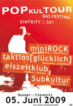 PopKulTour in Chemnitz Hallo Leute, am kommenden Freitag (5. Juni 2009) sind wir im Rahmen des PopKulTour-Festivals im Bunker in Chemnitz (zusammen mit minirock, taktlos[glücklich] und subkultur). Schaut mal rein! Den Bunker findet Ihr in Chemnitz auf Rosenplatz 7. Auf der Website des Bunkers gibt's super Wegbeschreibungen ;-) Der Eiszeitklub Alle aktuellen Termine findet Ihr unter Konzerte. |